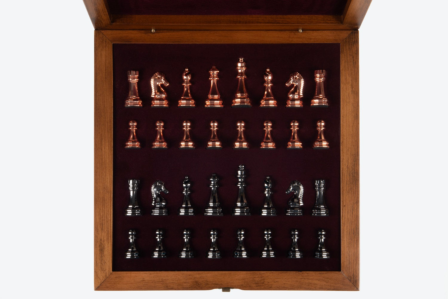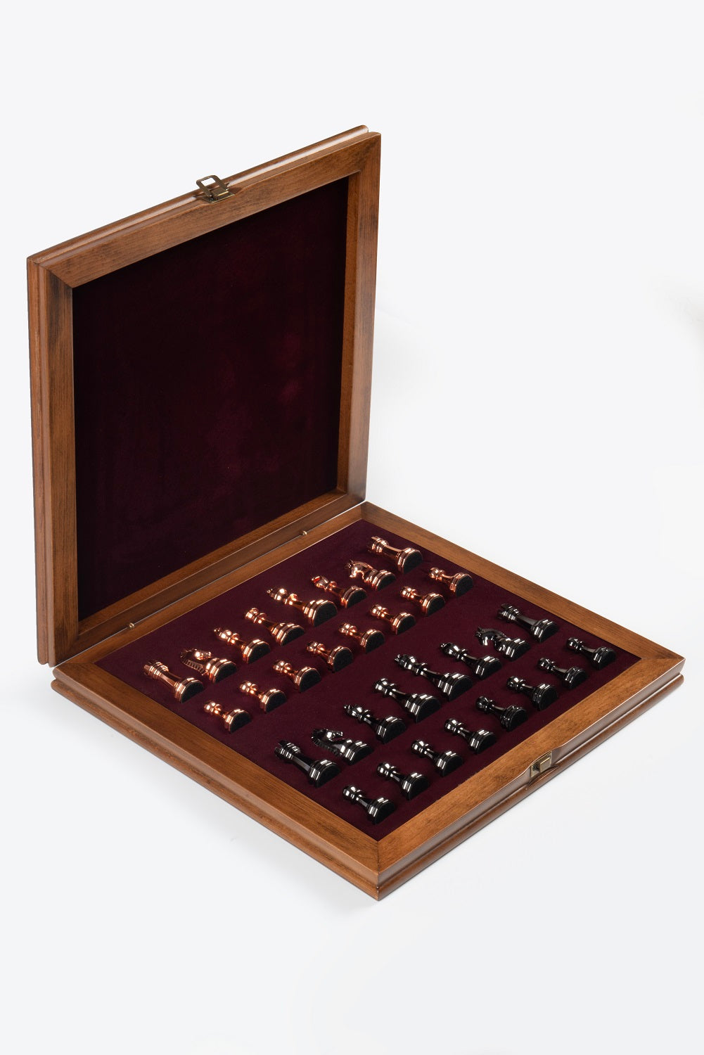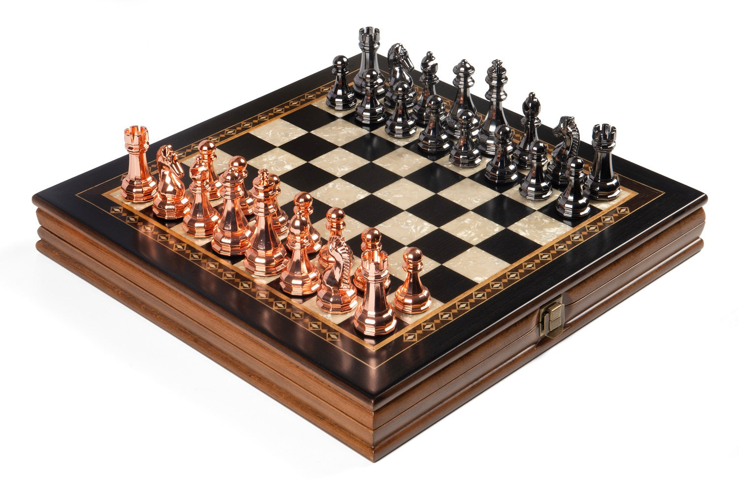 All colors you see on board box are natural colors of various woods. Classy metal chess pieces will make your chess game experience even better.