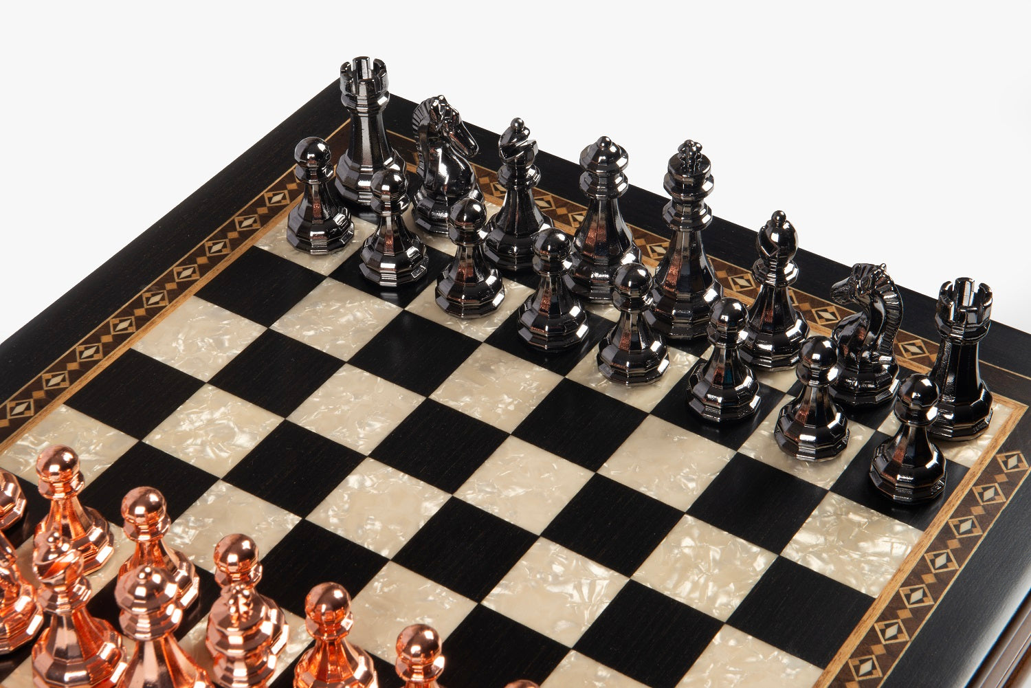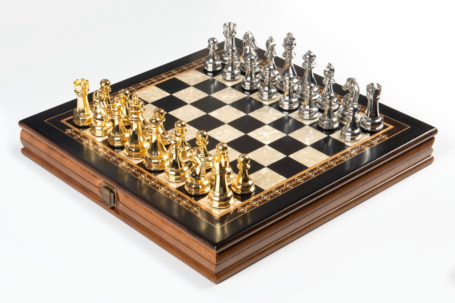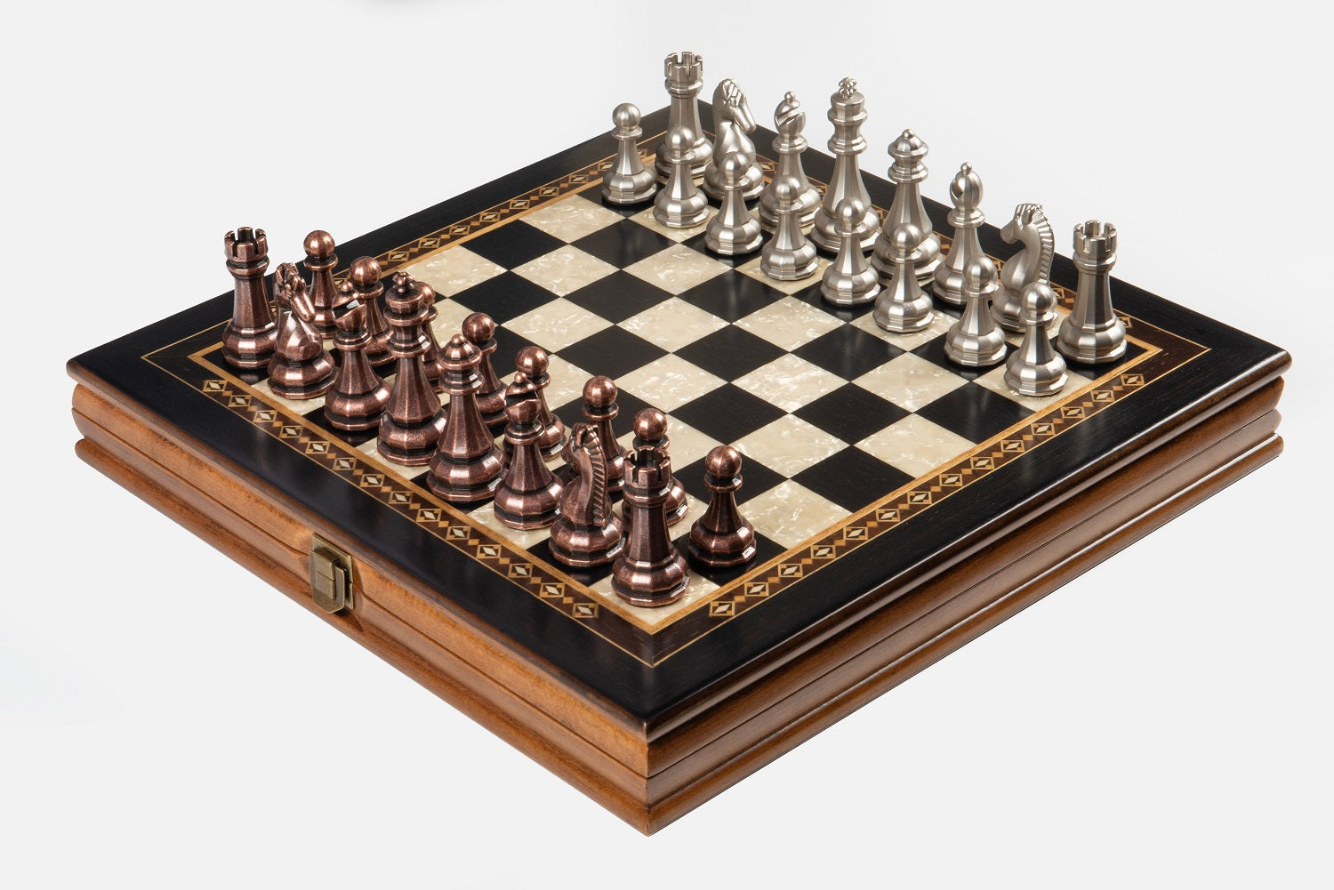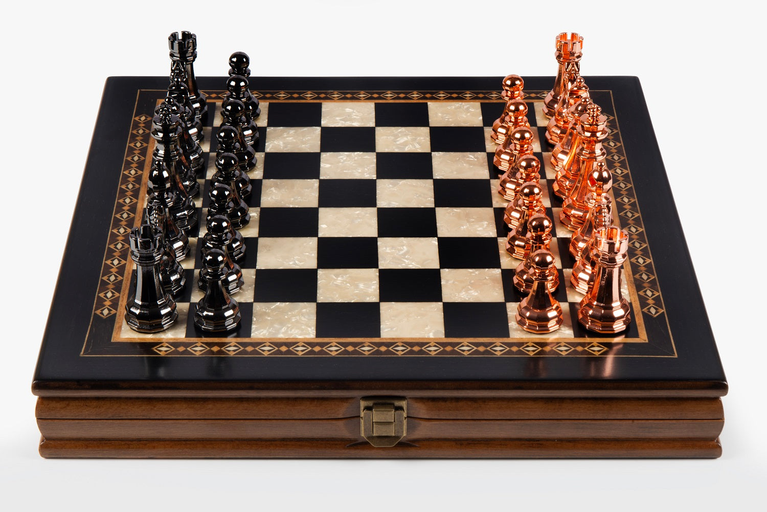 All colors you see on board box are natural colors of various woods. Classy metal chess pieces will make your chess game experience even better.