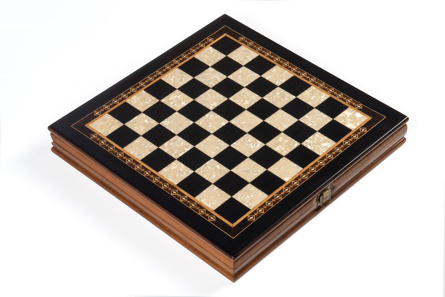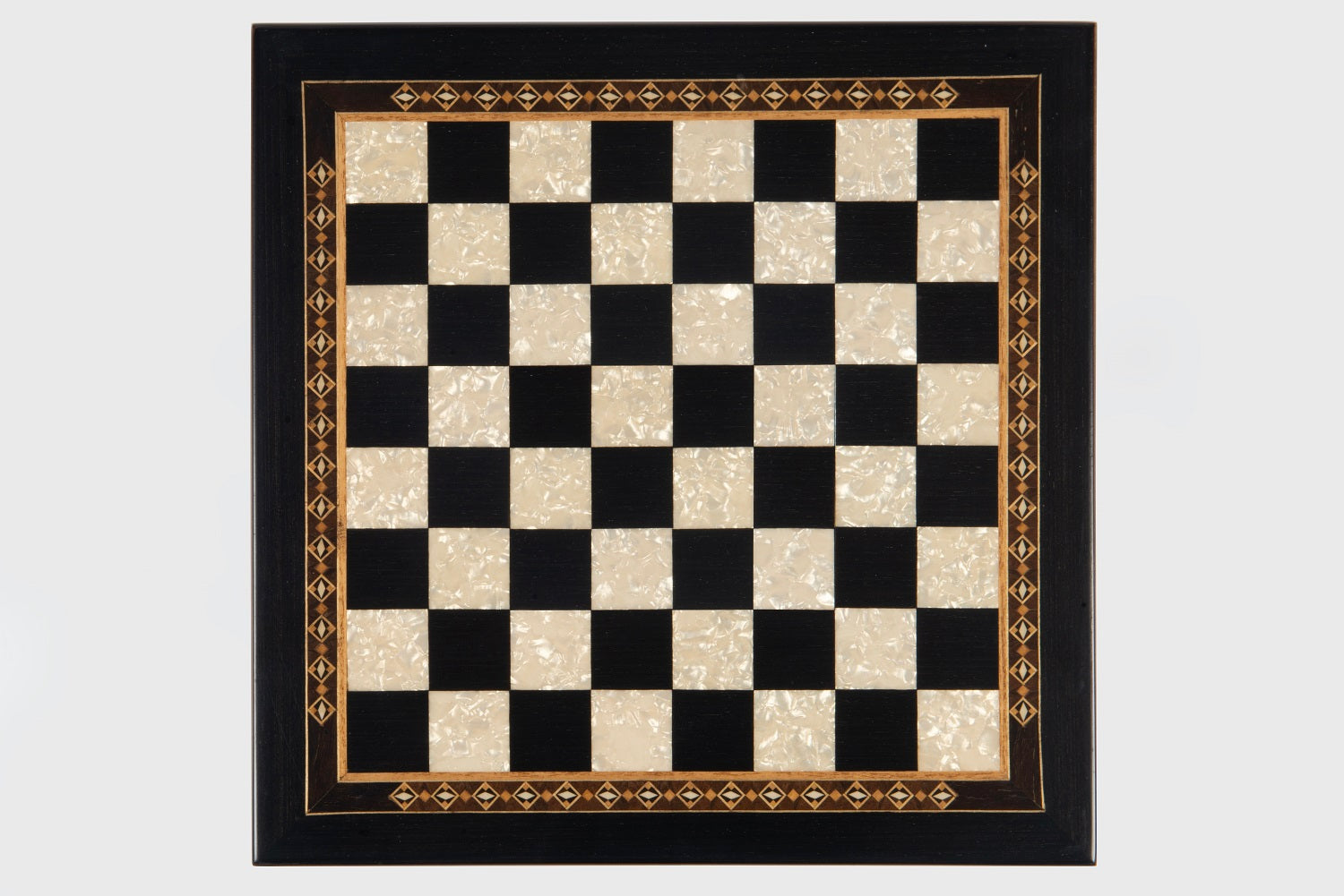 The main board is made of wood .Squares are inlaid with rose veneer and mother of pearl .Sides are decorated with handmade wooden mosaic .
