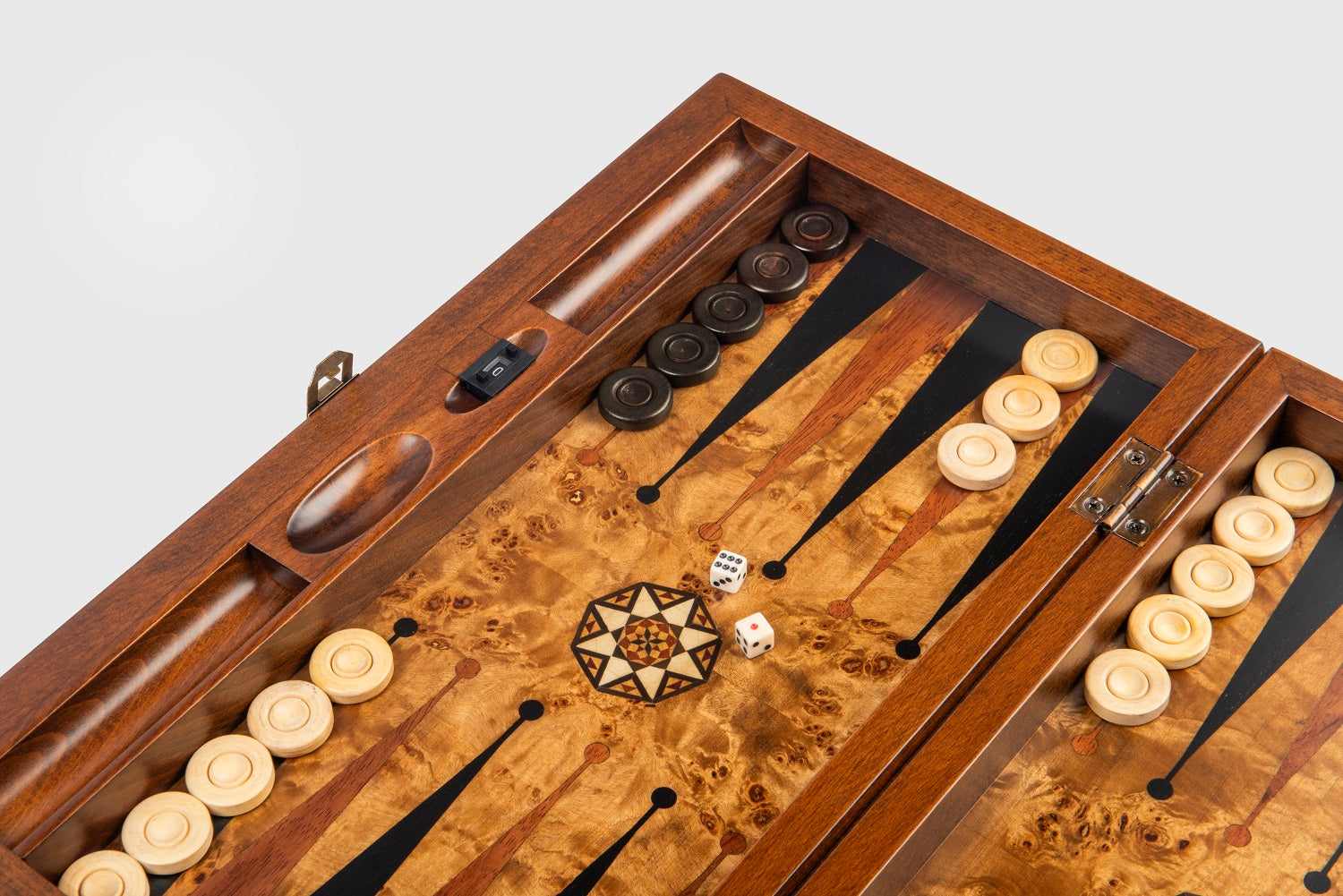 This luxury rosewood backgammon board is designed for those who appreciate authenticity, elegance, and masterful workmanship.